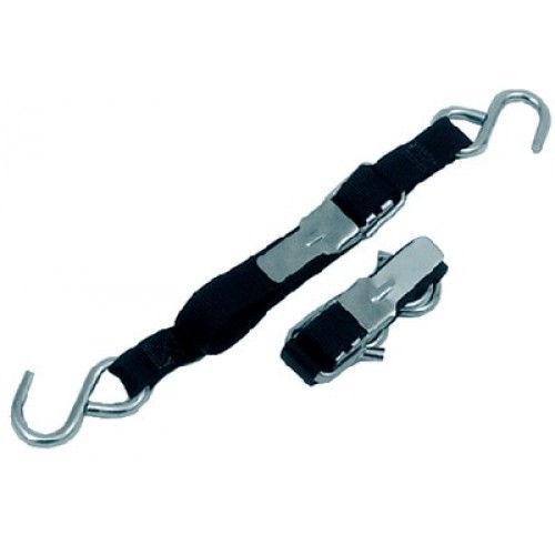 Strong weather-resistant polypropylene webbing, heavy gauge hooks, coated hardware, and rapid ratchet mechanism for tightening the strap.